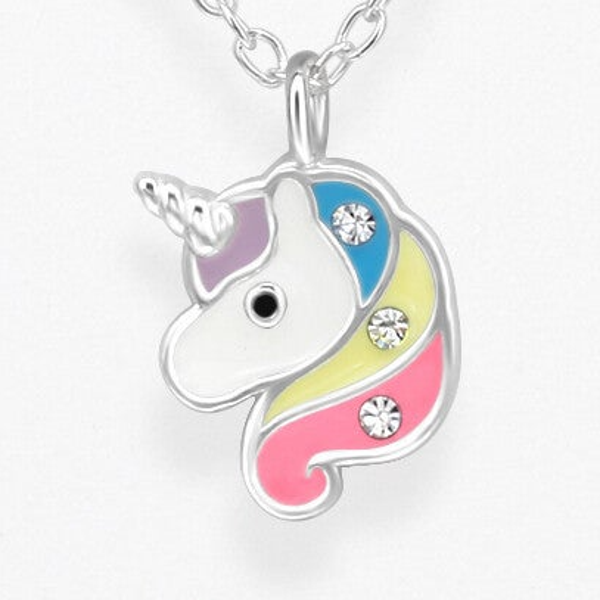 Uit mijn populaire lijn zilveren kindersieraden is deze schattige eenhoornketting met kristal en epoxy op een Believe in Unicorns-kaart een favoriet bij kinderen.