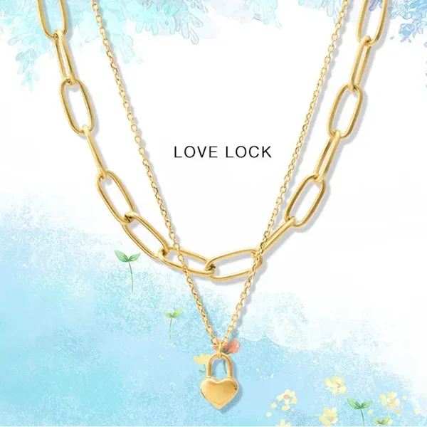 De dubbele stainless steel ketting, 18k verguld, vangt het licht bij elke beweging — een subtiele kracht in de grove schakel en tedere zachtheid in de fijne lijn. Aan de dunne ketting rust een hart met een slot, een symbool van liefde die niet vluchtig is, maar blijft.
