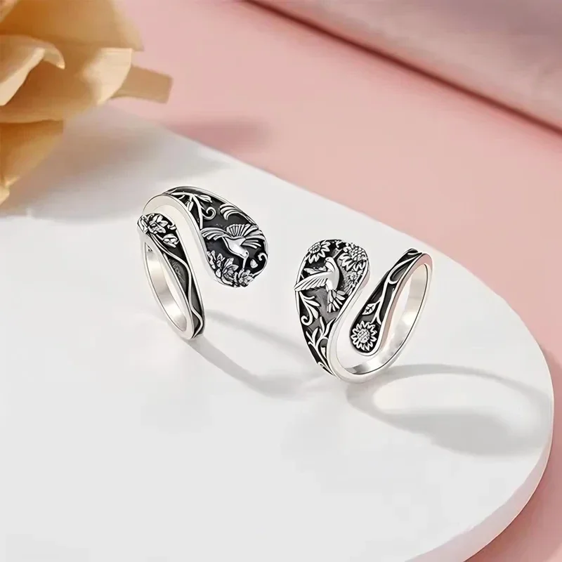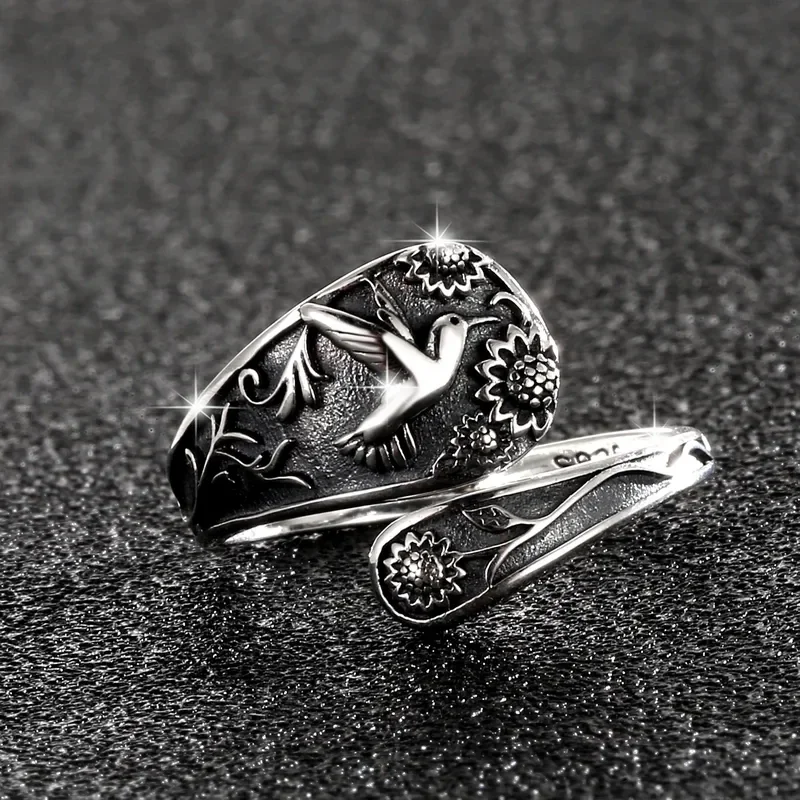 Boheemse Zilveren Ring – Unisex, Verstelbaar, Uniek Design met Vogel & Zonnebloem