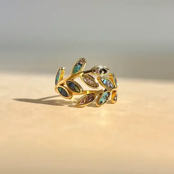 Deze elegante meerkleurige ring met parelmoer bloemblaadjes van stainless steel