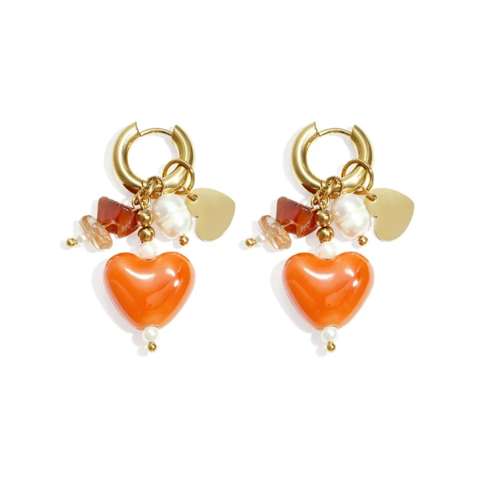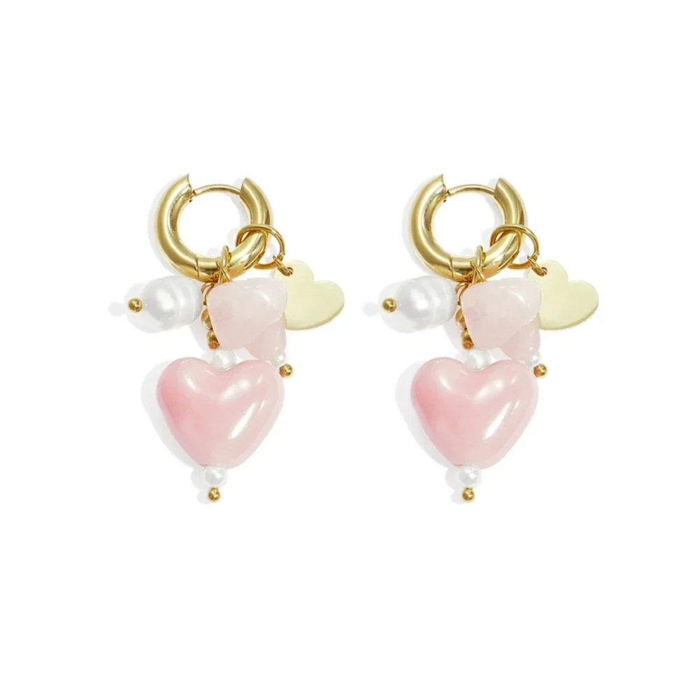 Geef je look een verfijnde en romantische touch met deze elegante hartoorbellen. Het sierlijke hartontwerp wordt prachtig aangevuld door een bijzondere combinatie van parel, kristal, steen en keramiek, waardoor de oorbellen een luxe en unieke uitstraling krijgen.