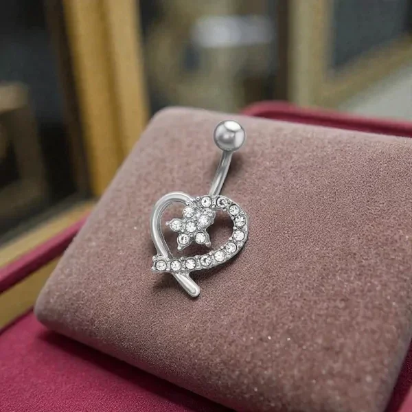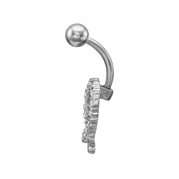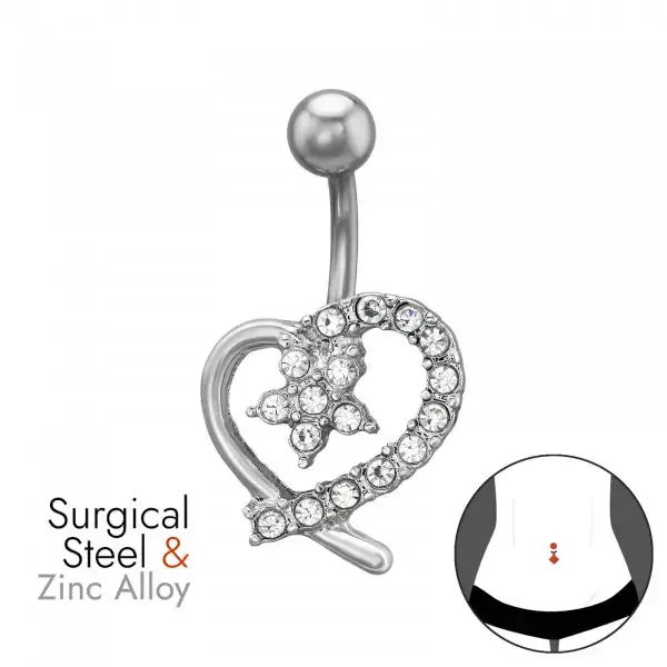 15 mm hartvormige piercing met sterretje van zinklegering voor de navel, bezet met 17 kubieke zirkonia steentjes op een 1,6 x 10 mm (14G) 316 chirurgisch stalen staafje met schroefdraad en een glad balletje van 5 mm.