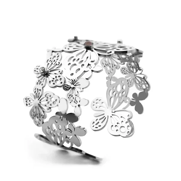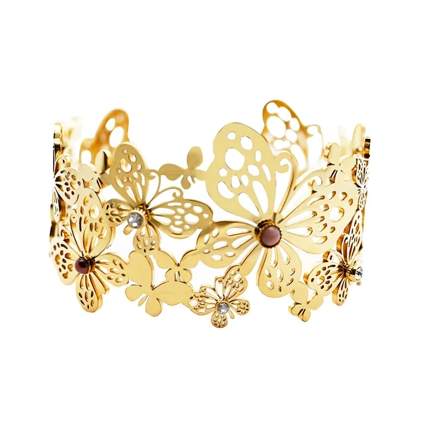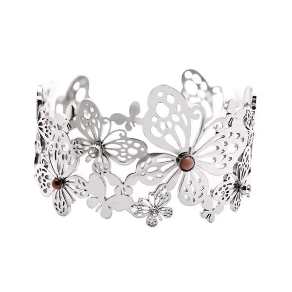 De verfijnde vlinderdetails, gecombineerd met strass en steen, zorgen voor een sprankelend en vrouwelijk effect. Met een dikte van 40 mm valt de armband mooi op, terwijl het ontwerp toch licht en comfortabel blijft.