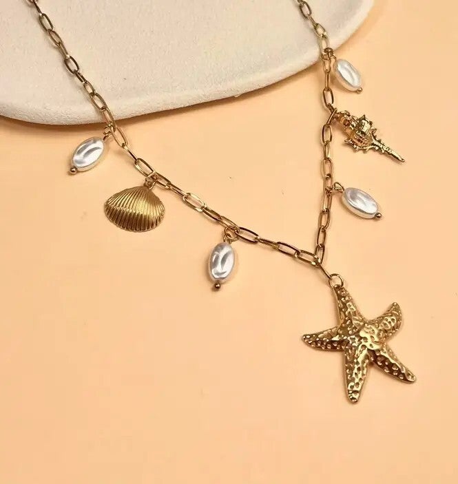 Deze vergulde roestvrijstalen ketting viert de maritieme geest met zijn hangers van zeesterren, schelpen en parelmoerparels. De fijne schakels van de ketting zorgen voor lichtheid en elegantie, ideaal om je zomerse outfits op te fleuren. Waterbestendig en duurzaam, het combineert bohemien charme met een verfijnde afwerking, perfect voor een trendy stijl in elk seizoen. Van roestvrij staal, zonder nikkel, zonder cadmium en zonder loodzout.