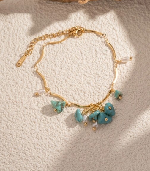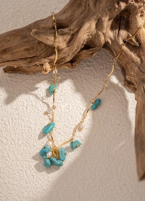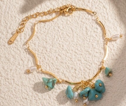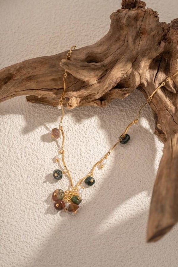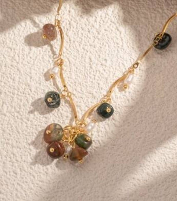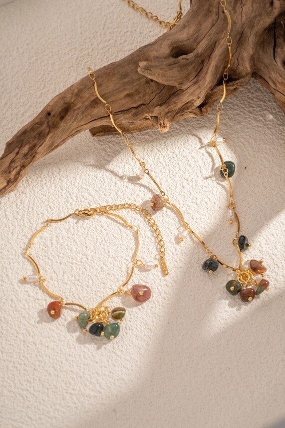 Deze gouden set combineert een ketting en armband versierd met natuurlijke stenen en fijne parels. Elk stuk onthult een harmonie tussen glans en authenticiteit, met levendige kleuren en een ambachtelijk ontwerp. Verstelbare kettingen voor perfect comfort. Een elegante en bohemien duo, ideaal om je stijl dagelijks of bij speciale gelegenheden te verfraaien. Van roestvrij staal, zonder nikkel, zonder cadmium en zonder loodzout.