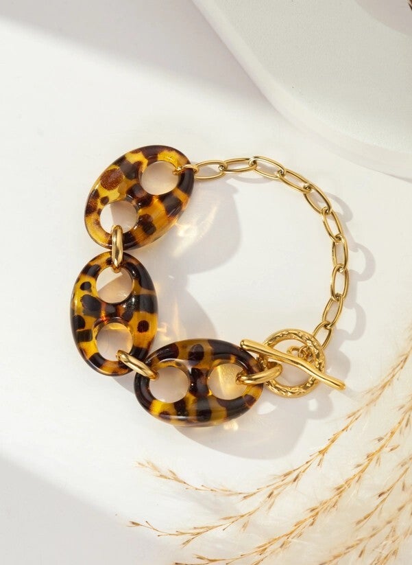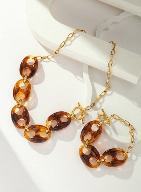Val voor deze elegante set bestaande uit een bijpassende ketting en armband, die amberkleurige schakelkettingen combineert met een gouden roestvrijstalen ketting. Modern design, verfijnde toggle-sluiting en zorgvuldige afwerking: een perfect duo om je outfits te verfraaien. Hypoallergeen en waterbestendig, dit sieraad is geschikt voor de gevoelige huid. Ideaal voor een gedurfde en verfijnde look, van dagelijks gebruik tot speciale gelegenheden